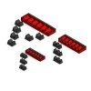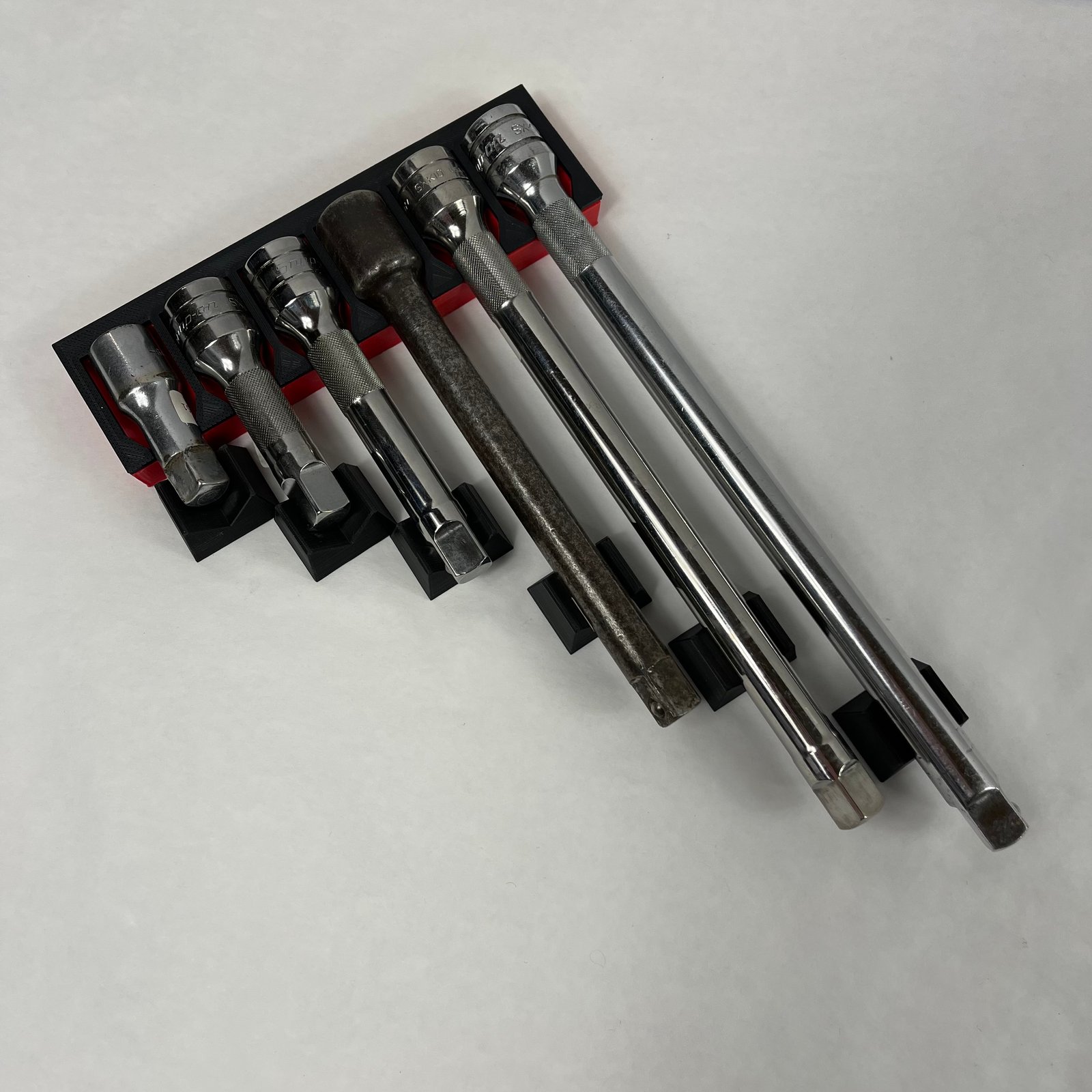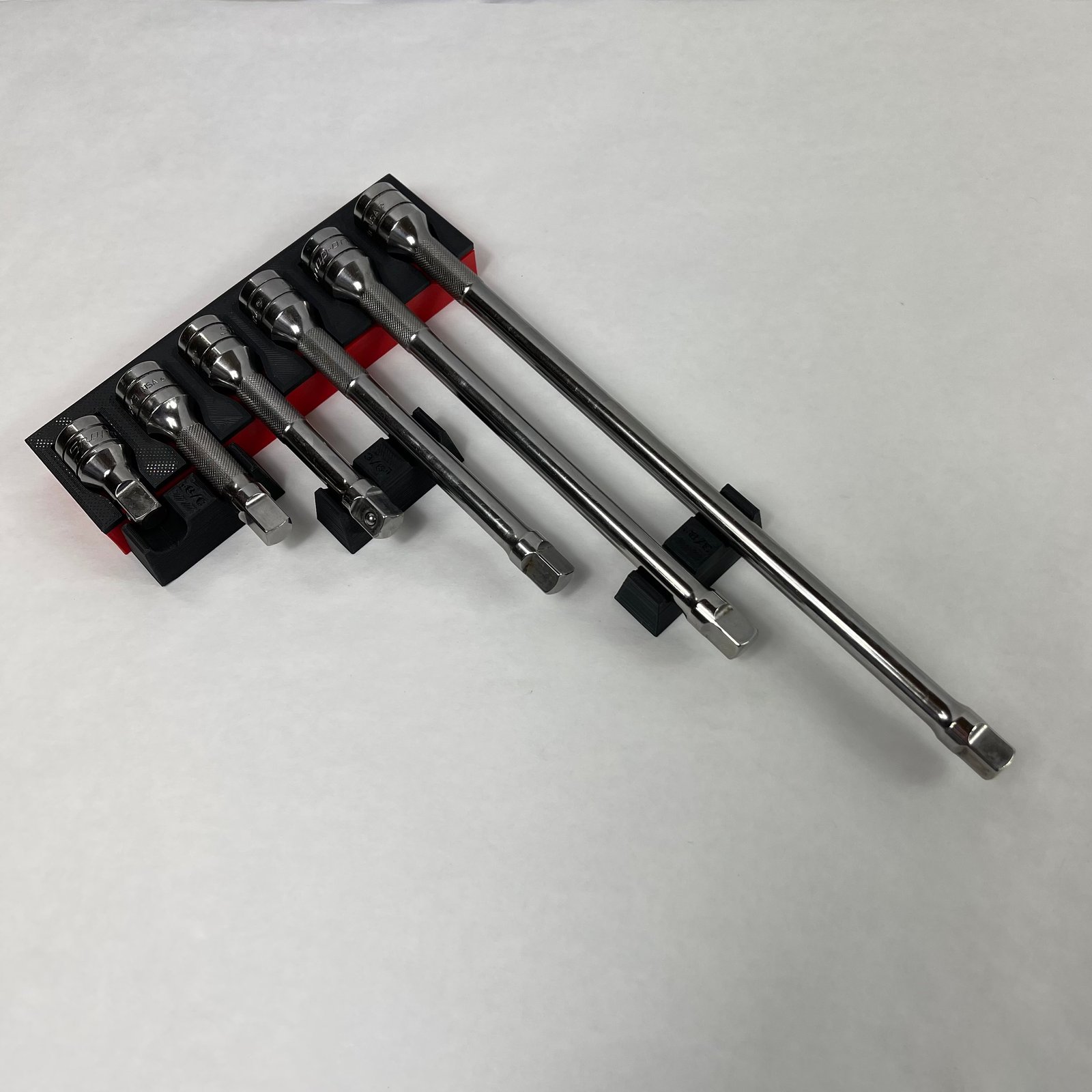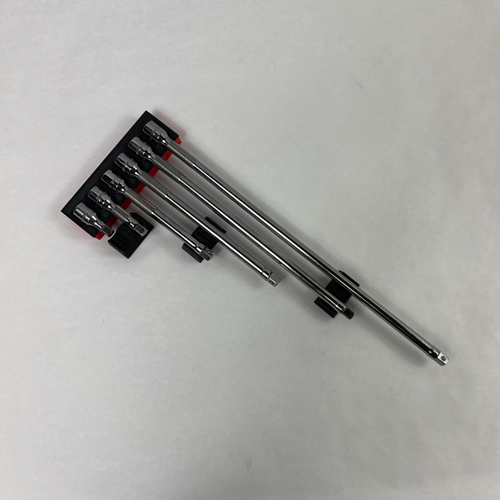 The starter set includes the larger “head” side to fit the drive side of (6) chrome extensions of each size (1/4″, 3/8″ and 1/2″) as well as the required shaft supports.